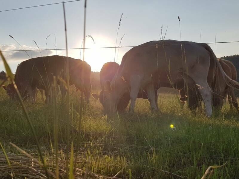 Das Fleisch stammt von unseren Bio Gelbvieh Jungbullen, welche im eigenen Betrieb geboren, 10 Monate bei der Mutterkuh mitlaufen. Anschließend werden sie mit eigens erzeugtem Getreideschrot und viel frischen Kleegras gemästet. Die Schlachtung erfolgt mit 16 - 18 Monaten. Dies macht das Fleisch besonders appetitlich.